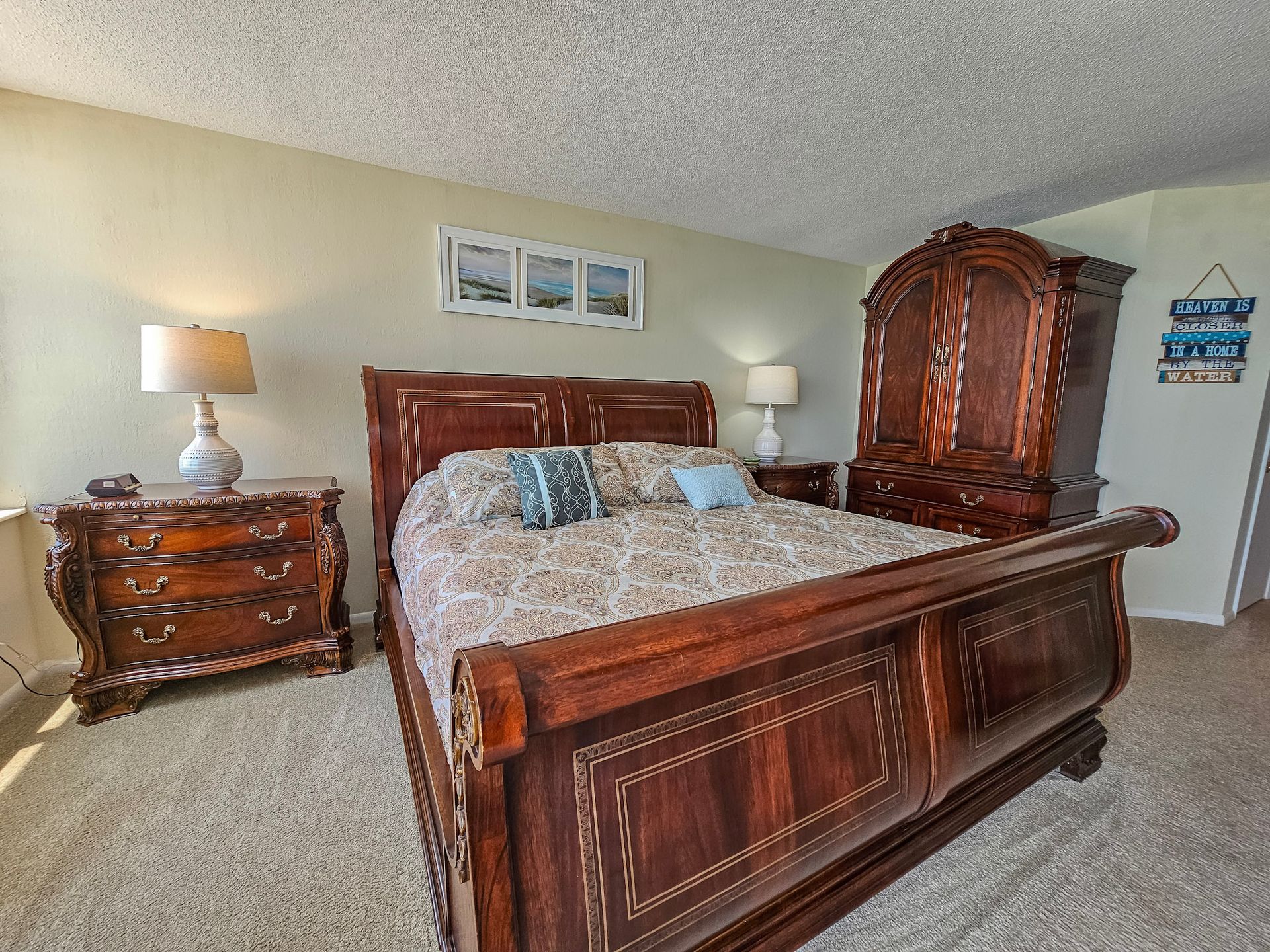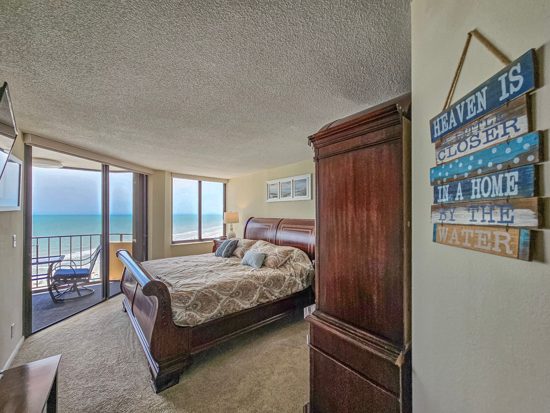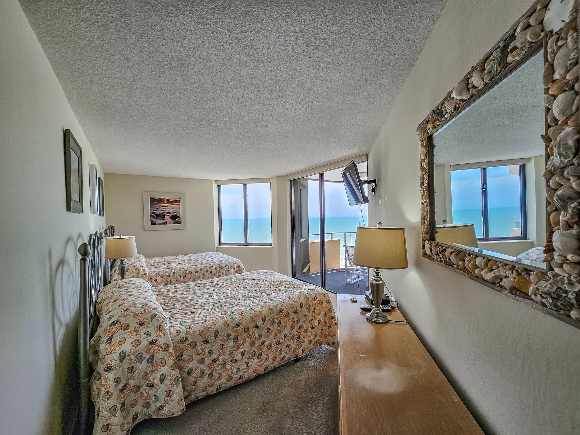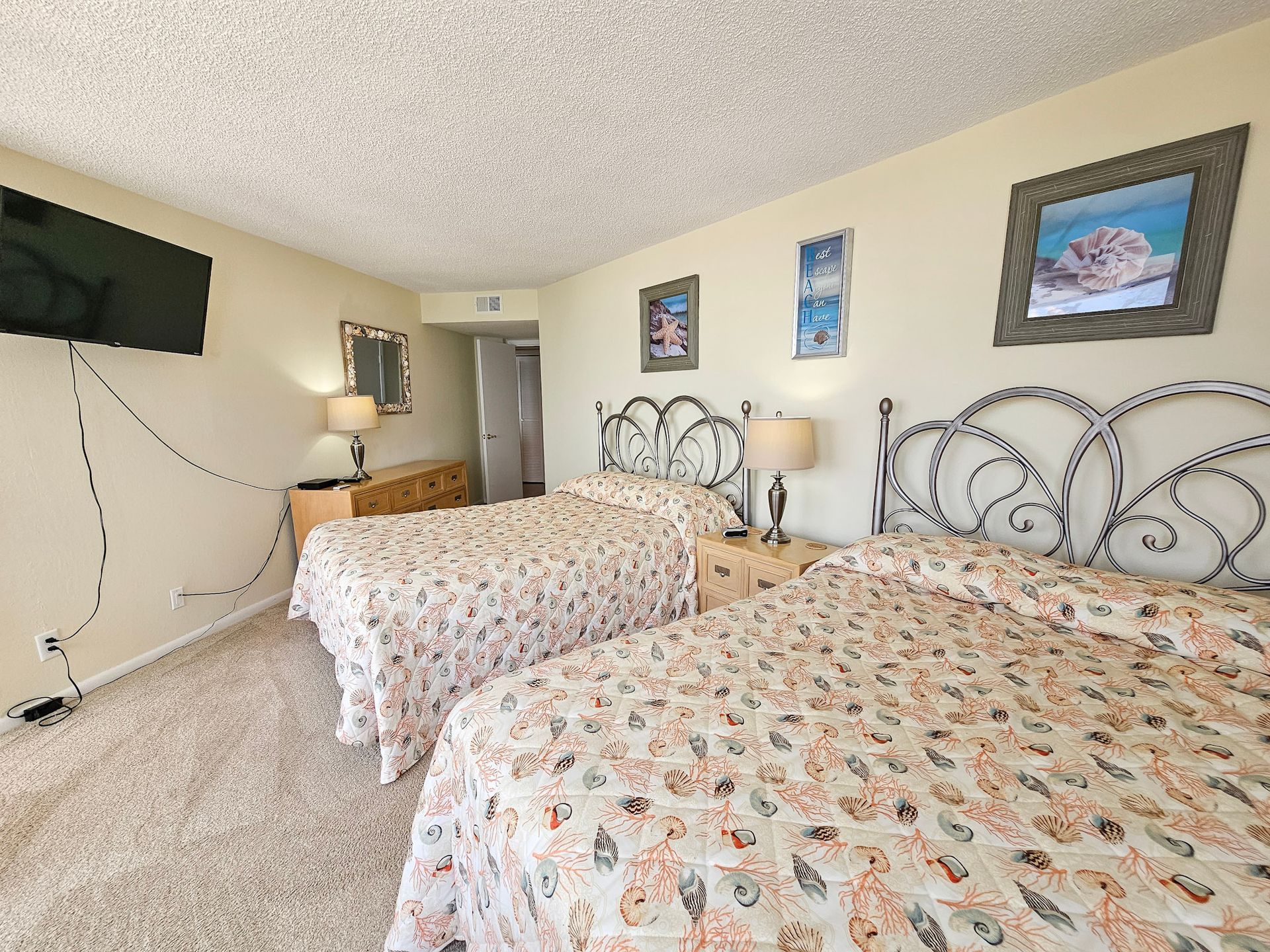 The master bedroom has a king size bed and the guest bedroom has a two queen beds. There is a TV in the living room, in addition, both bedrooms have a TV. A laundry room with a washer and dryer is also inside the unit for your convenience.